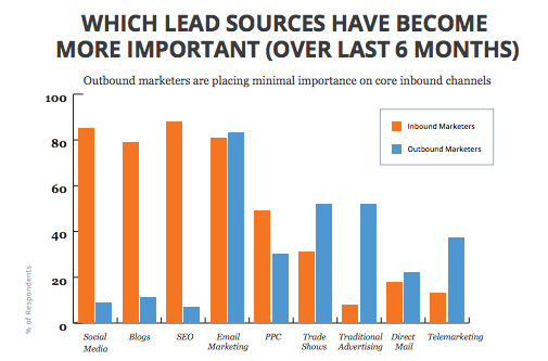 5. Oamenii de marketing graviteaza catre canale de inbound, in timp ce oamneii de vanzari sunt inca foarte implicati in tactici de outbound